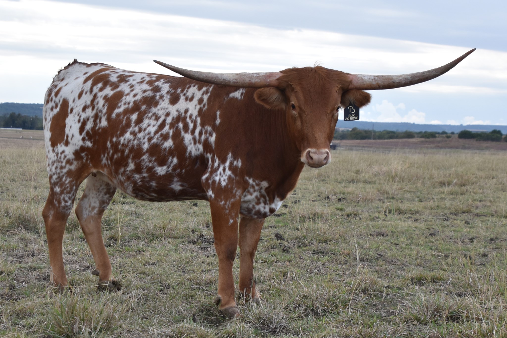 BUX 20 Rose is a gorgeous young heifer who perfectly represents the Buxton breeding program — a balance of elite genetics, feminine style, and modern horn potential. She’s sired by Rebel HR, one of the breed’s most respected bulls, combining horn, body, and color in a line that consistently produces standouts. Her dam, Hubbells 20 G Special, brings the influence of Hubbells 20 Gauge, Concealed Weapon, and Cowboy Catchit Chex — a powerhouse lineup known for producing elite horn genetics and structural consistency. The combination of Rebel HR and 20 Gauge bloodlines gives Rose a double dose of proven excellence on both sides of her pedigree. BUX 20 Rose carries a strong, balanced frame with impressive early horn growth and the trademark speckled color that catches every eye in the pasture. She has presence, poise, and the kind of natural elegance that makes her a future front-pasture female and potential showpiece producer.